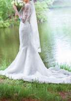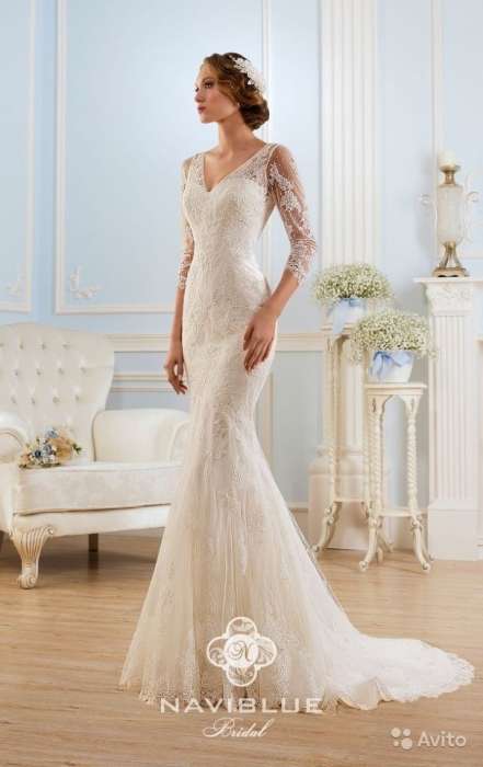 Свадебное платье известного американского бренда Navi Blue. Элегантное платье силуэта "русалка" . Ткань - основа французский тюль, украшено кордовым кружевом с пайетками. Подол, шлейф и манжеты платья оторочены кружевом. Цвет светлое айвори - слоновая кость. Свадебное платье после химчистки. Размер скорее даже 40-42. Торг уместен.